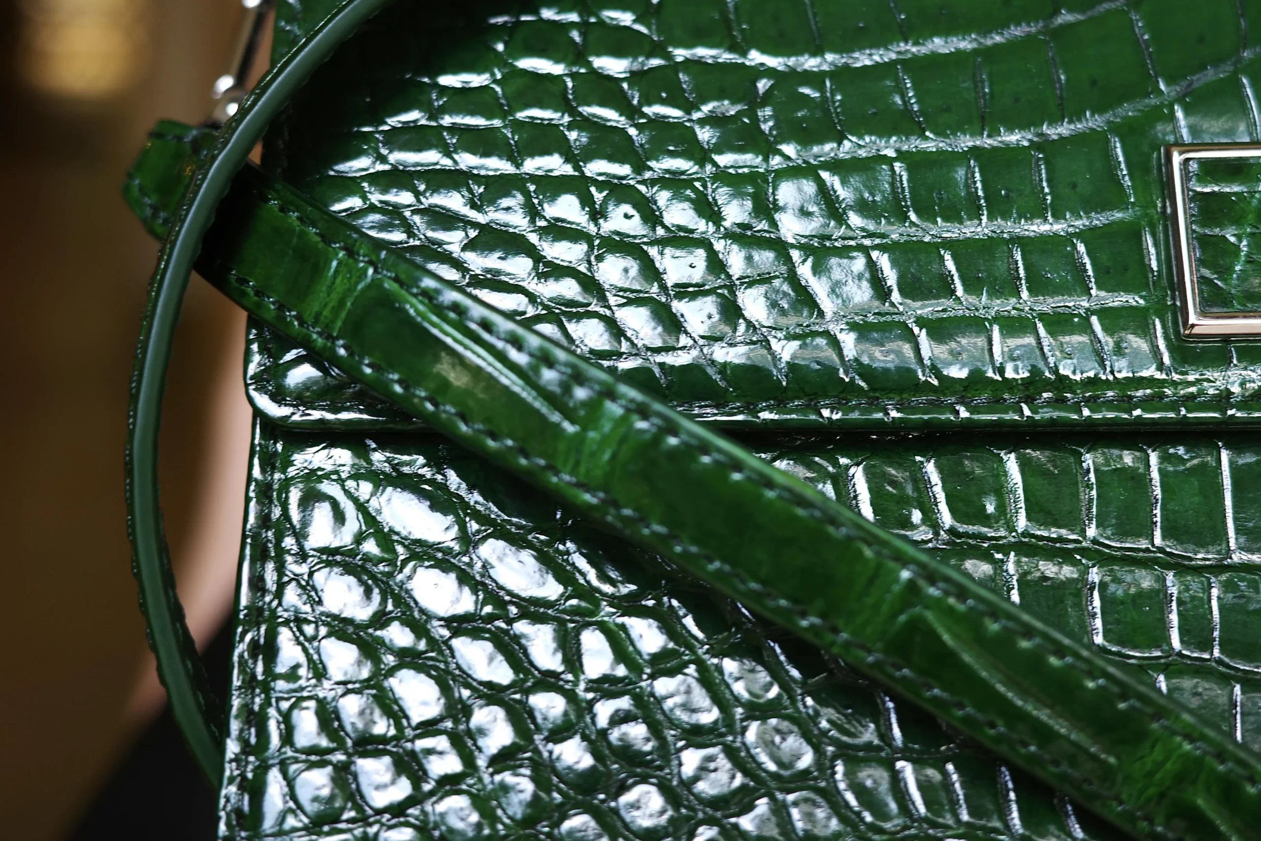 Every inch is carefully crafted from genuine certified crocodile leather, kissed by light, textured with intention. More than a purse, a sculpture in motion, a piece that embraces the passionate pulse of the artisan. Each subtle detail, from the confident twist-lock to the polished curve, whispers of precision and skills.